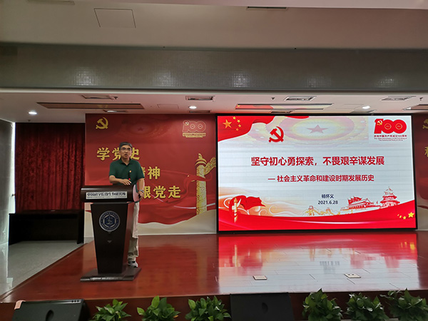 工业室第一党支部书记杨怀义讲了题为“坚守初心勇探索,不畏艰辛谋发展”的党课,从新中国成立开始,从社会主义改造、社会主义制度建立以及社会主义建设的探索和曲折发展等方面讲述了党在社会主义革命和建设时期的发展历史。指出党史学习教育是党的政治生活中的一件大事,党员同志应该从党的非凡历程中感悟马克思主义的实践力量,不断总结经验,提高本领,从历史中获得启迪,努力工作,发挥国家战略科技力量的作用。