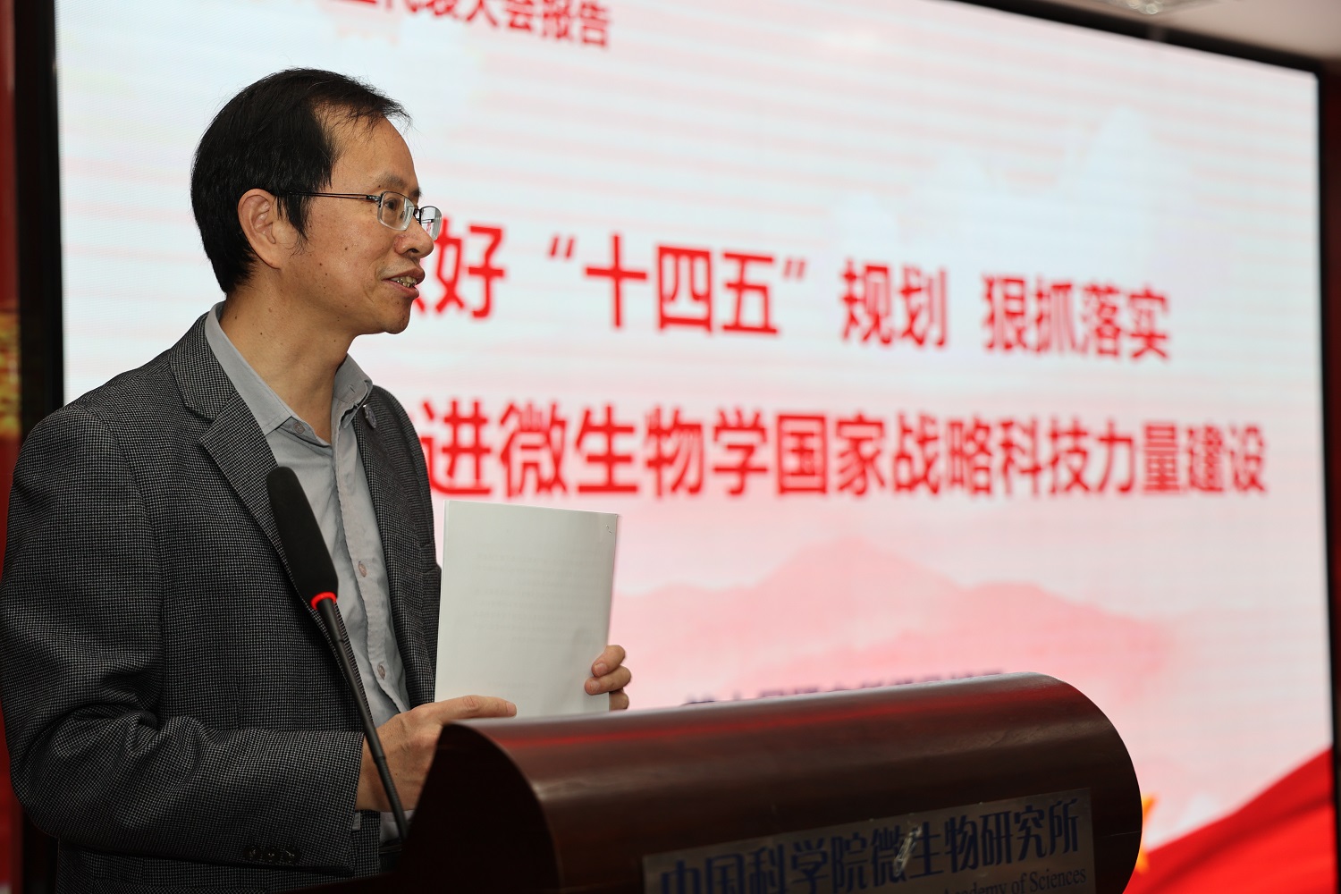 会议第一阶段,钱韦所长作《做好“十四五”规划、狠抓落实,加速推进微生物学国家战略科技力量建设》报告,全面回顾和总结了研究所2021年度工作和发展情况,介绍了研究所的定位和使命、基础前沿项目和重大成果、研究所发展现状与趋势、财务工作报告、研究所十四五规划、2022年重大改革措施。他重点介绍了研究所科技工作及重大产出情况,我所在国家和院重大项目的申请及立项、基金的获批、论文、知识产权等方面都获得了突破性进展。在原有成绩的基础上,推出了新的疫苗、广谱抗体,维生素B5的生物合成与绿色制造等多项代表性成果。钱韦所长还介绍了“三年行动方案”的八个方面:一、加强党的领导,弘扬干事创业的科学家精神;二、聚焦主责主业,承担和高质量完成国家重大科技任务;三、加强面向未来的前沿和交叉基础科学研究布局;四、加强使命驱动的建制化基础研究团队建设;五、激励和促进重大科技成果产出;六、增强人才队伍实力,加快青年学术带头人引进培养;七、加强优秀青年科技人才和特别研究助理队伍建设;八、加强科技支撑,改善创新生态,加强高水平学术交流,营造积极科学文化氛围。