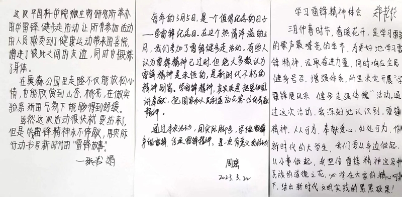 3月1日、10日、15日、24日每天中午,500余名微生物所职工、学生党员和入党积极分子在奥林匹克森林公园的健步道上挥洒汗水,他们精神饱满、步伐稳健,展现着雷锋精神中乐观昂扬的精气神。同时,研究所组织了阅读雷锋日记、讲述雷锋故事、抄写雷锋名言等丰富活动,鼓励干部职工特别是青年人积极交流学习感悟。