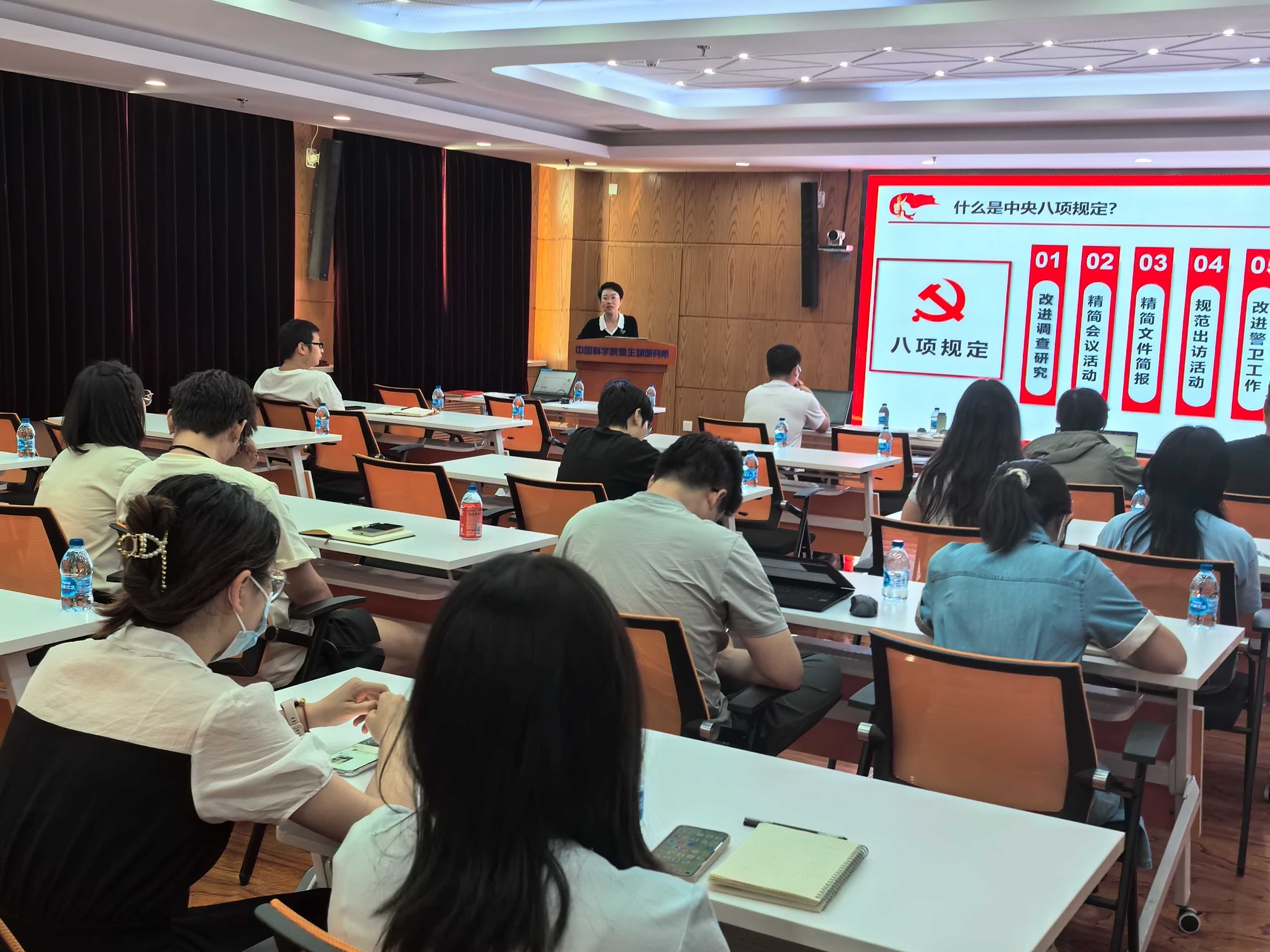 王奇慧首先回顾了中央八项规定与中央八项规定精神的内涵和外延。并从政治上,经济上,社会上,文化上与国家治理上等角度,用一个个鲜明的案例讲解了八项规定如何生动的改变着中国。她强调,深入学习中央八项规定精神,要同抢占科技制高点核心任务结合起来,同深入推进党风廉政建设和反腐败斗争结合起来,同深入开展“深化党纪学习教育、严明岗位工作纪律”专项工作结合起来,同强化作风学风、加强新时代创新文化建设结合起来。此外,她还通报了违反中央八项规定精神典型案例,提醒各位党员要时刻保持警醒,筑牢廉洁自律的思想防线。