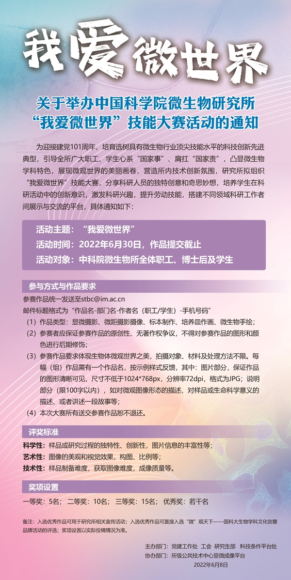 为迎接建党101周年,培育选树具有微生物行业顶尖技能水平的科技创新先进典型,引导全所广大职工、学生心系“国家事”、肩扛“国家责”,凸显微生物学科特色,展现微观世界的美丽画卷,营造所内技术创新氛围,研究所拟组织“我爱微世界”技能大赛,分享科研人员的独特创意和奇思妙想,培养学生在科研活动中的创新意识,激发科研兴趣,提升劳动技能,搭建不同领域科研工作者间展示与交流的平台,具体通知如下:
