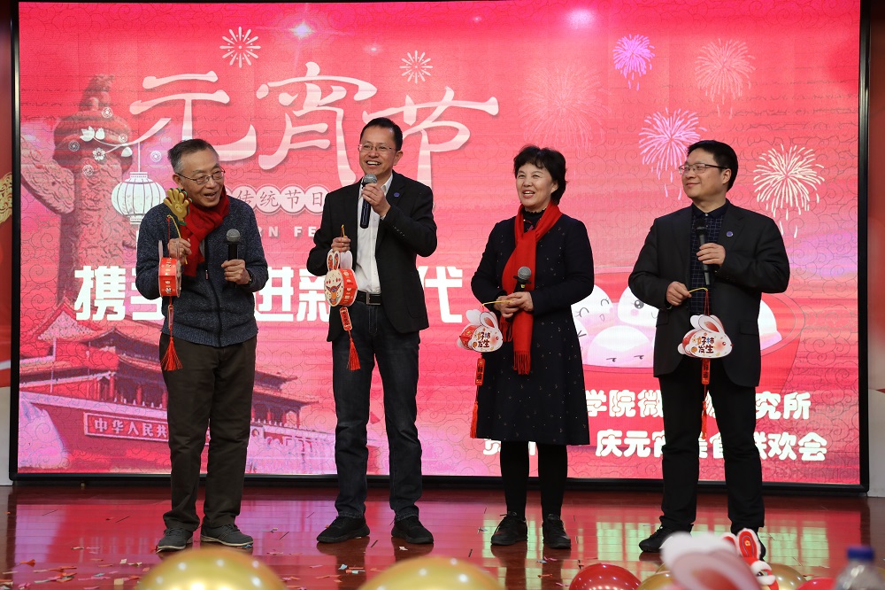 一起庆祝元宵节,联欢会设置多次观众互动环节,所有人都参与其中,感受着微生物所的节日气氛与整体的向心力。联欢会为生肖兔的老师送去了元宵节的小玉兔。抽奖环节,生肖兔的老师们为大家抽取了三等奖,林明炯书记为大家抽取了二等奖,钱韦所长和王丽萍书记为大家抽取了一等奖,获奖的观众幸运喜悦,未获奖的观众也受到感染热列欢呼。工作人员为大家送上了煮好的汤圆,象征着团团圆圆的美好。大家一起闹元宵,游戏环节大朋友小朋友都争先恐后上台参加,现场一片欢声笑语,喜庆祥和。