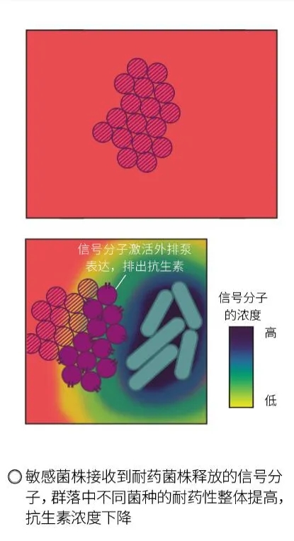 群落中的细菌是个有爱的大集体,会互相帮助以提高整体耐药性。我们可以感应其他同胞分泌的各种化合物(信号分子),互补配合,调控基因表达,耐药能力大大提升。