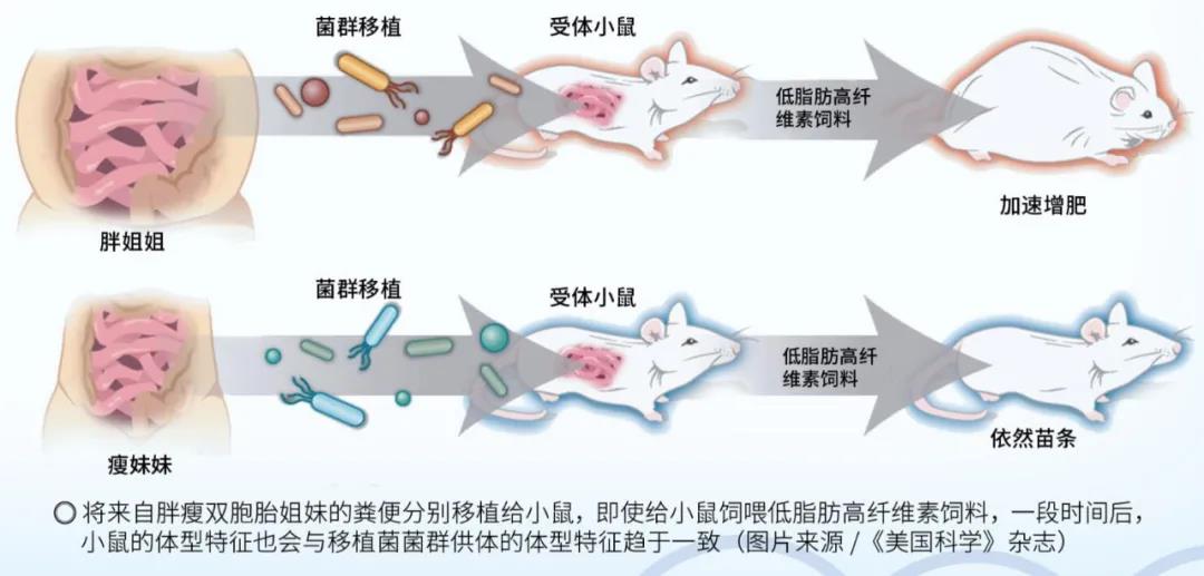 科学家将肥胖病人的粪便移植给无菌小鼠并饲喂高脂肪低纤维素饲料,小鼠出现了肥胖及胰岛素抵抗的症状,说明其代谢功能已发生改变。若将胖瘦不同的双胞胎姐妹的粪便移植给无菌小鼠,即使给予高纤维低脂肪的“健康食品”,移植了胖姐姐粪便的小鼠仍比移植了瘦妹妹粪便的小鼠胖,说明肠道微生物在代谢过程中发挥着重要的作用。