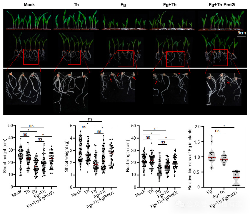 接种禾谷镰刀菌+改造后的工程菌株(Th-FgPmt2i):玉米根部仅有少量浅色斑点,株高、鲜重和根长显著优于前两组,几乎达到健康玉米的生长指标!