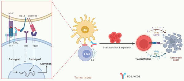 图1:双特异性抗体PD-L1xCD3介导的抗肿瘤免疫反应(Nature Biomedical Engineering, 2021)