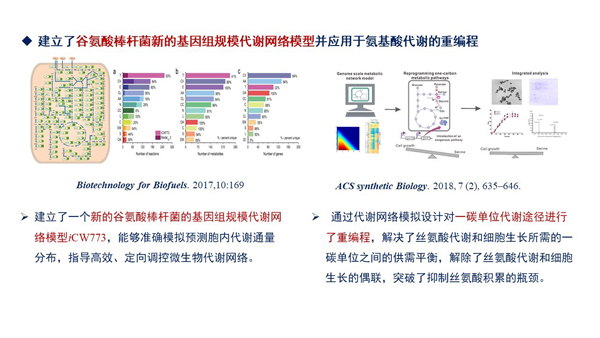 以微生物和真核细胞为研究对象,设计构建基因组规模代谢网络模型,并在其指导下利用系统生物学和合成生物学的方法,研究氨基酸、核苷酸及其衍生物的生物合成和代谢调控机制,阐明氨基酸、核苷酸代谢与肿瘤发生及代谢性疾病的相关性。解析重要生命活动和代谢过程中关键酶的晶体结构,指导蛋白质定向进化,改造酶分子特性。开发高效基因组编辑、新型调控元件、生物传感器等合成生物学技术,应用于重要生物基产品(氨基酸、核苷酸、维生素及有机胺等)和生物制剂(疫苗、抗体及生物大分子等)细胞工厂的构建及产业化。
