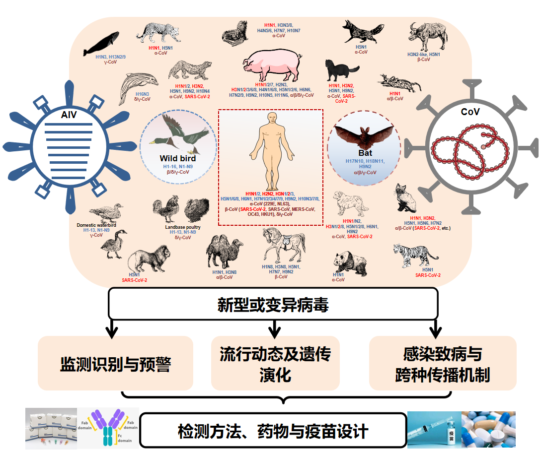 变异或新型病毒的监测预警、遗传演化、跨种传播和致病机制及生物安全综合防治策略的研究。