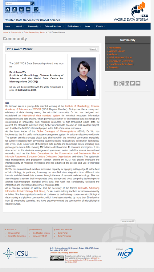 WDS隶属于International Council for Science (ICSU),致力于全球科学数据共享和服务,目前由包括75 常规会员,11个网络会员等在内的超过100个机构会员组成,是国际上最重要的科学数据组织之一。WDS Data Stewardship Award由WDS科学委员会评选,每年授予一位40岁以下数据学家。这也是该奖项首次授予来自发展中国家和生命科学领域的提名人选,充分说明我国生命科学领域科学数据发展已经逐步走向世界前列。
