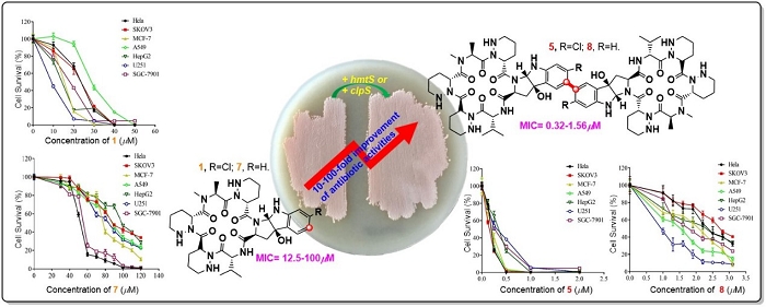 白黄菌素(Alboflavomycins,AFNs)是由白黄链霉菌313(Streptomyces alboflavus sp.313)产生的一类新型环六肽类抗生素。其结构与二聚化的环六肽类化合物chloptosin和himastatin的单体非常相似,都含有独特的吡咯吲哚环结构。初步测定显示白黄菌素具有中等抗菌和抗肿瘤作用,但还不足以作为候选药物进行开发。通过分析chloptosin和himastatin的单体和二聚化分子的构效关系,推测白黄菌素类抗生素如果能在吡咯吲哚芳香环上形成位置特异性的C5-C5'联芳基二聚化产物,其生物活性将会大大提高。但如此复杂的分子中,吡咯吲哚芳香环上位置特异性的联芳基二聚反应在化学上是极大的挑战。围绕这个设想,陈义华课题组研究人员解析了白黄菌素的生物合成途径,通过操作生物合成基因获得了多种白黄菌素的衍生物。同时,得益于微生物次级代谢丰富的多样性,挑选了识别类似环六肽底物的催化二聚化反应的P450酶ClpS和HmtS,采用组合生物合成技术获得了两个C5-C5'位碳碳键连接的白黄菌素的联芳基二聚化衍生物5和8。随后的活性测试证明,如同设计的一样,5和8的抗菌和抗肿瘤活性相对单体(1和7)都大幅度地得到了提高,为白黄菌素类化合物的下一步研发奠定了坚实的基础。