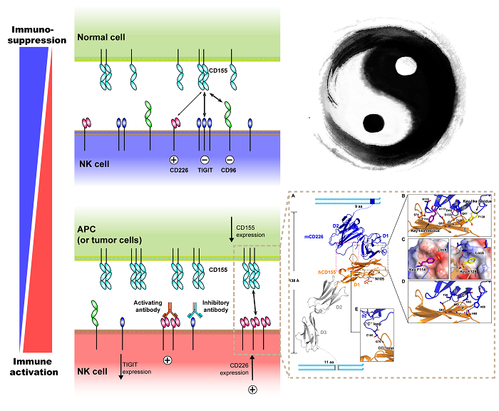 近年来,一类新发现的配对的NK细胞受体家族逐渐走入人们的视线,这就是由抑制型受体TIGIT、CD96和激活型受体DNAM-1(CD226)组成的TIGIT-CD226-CD96受体家族。该受体家族分子通过特异性地识别相同配体——nectin/Necl家族分子CD155(Necl-5),调控NK细胞功能。TIGIT更是作为一种抑制型免疫检查点分子,被广泛应用于各种靶点细胞治疗的研究和临床应用当中。DNAM-1是该家族中唯一的激活型受体分子。因此,对DNAM-1与其配体的作用机制的研究,不仅能够阐明其激活NK细胞的作用机制,而且对以DNAM-1为靶点的免疫治疗性药物的开发具有重要价值。