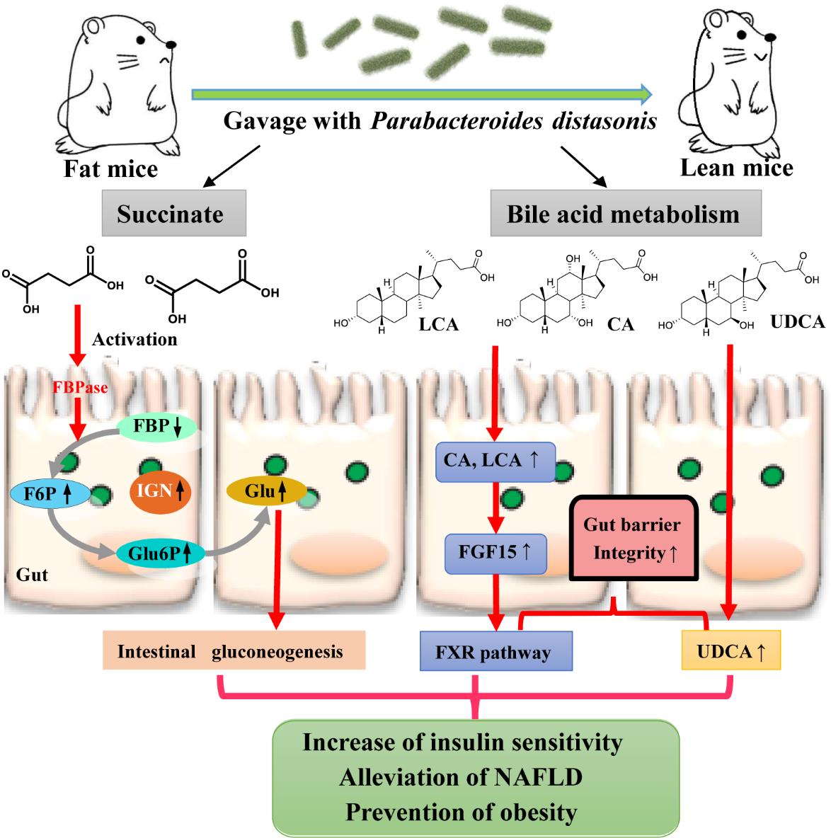 狄氏副拟杆菌(Parabacteroides distasonis)是人体核心菌群之一,相关性分析表明其含量与肥胖、非酒精性脂肪肝、糖尿病等疾病状态呈显著负相关,提示其可能在糖脂代谢方面发挥正向调节作用。微生物所刘宏伟与刘双江、王军研究团队紧密合作、协同攻关,发现狄氏副拟杆菌可以显著改善高脂饮食诱导肥胖(DIO)小鼠及ob/ob肥胖模型小鼠的肥胖、胰岛素抵抗、脂代谢紊乱及非酒精性脂肪肝症状。通过体内外实验首次发现狄氏副拟杆菌具有广泛的胆酸转化功能,能够水解多种结合型胆酸,同时转化为多种次级胆酸(石胆酸,熊去氧胆酸等);还可以产生大量琥珀酸。石胆酸等次级胆酸通过激活肠道FXR信号通路,改善脂代谢紊乱;熊去氧胆酸可以修复肠壁完整性;琥珀酸通过作用于肠道糖异生(IGN)途径关键酶果糖-1,6-二磷酸酶(FBPase),激活肠道糖异生,从而调节食欲,促进肝脏糖原合成,改善宿主糖代谢紊乱。狄氏副拟杆菌通过产生琥珀酸、次级胆酸通过激活不同的信号通路,发挥多靶点整体调节作用,是一种潜在、新型抗代谢综合症益生菌。