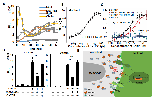 A.稻瘟菌分泌蛋白MoChia1可以激活ROS迸发;B. and C. 水稻蛋白OsTPR1与chitin竞争结合MoChia1; D. MoChia1抑制chitin激活的水稻免疫反应,但OsTPR1可阻止MoChia1的抑制效应;E. 工作模型:MoChia1抑制chitin激活的植物免疫,但OsTPR1阻止其抑制效应,且水稻中存在识别MoChia1的受体。