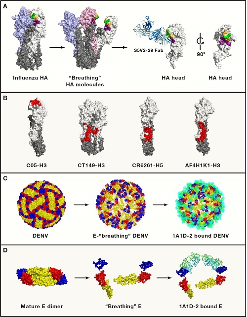 作者对同期两篇发表在Cell,一篇发表在Cell Host & Microbe杂志的文章进行了评述。这三篇文章报道了隐藏在HA三聚体头部区的新表位,HA分子通过病毒“呼吸”暴露出这类表位,从而使机体产生识别该表位的抗体。然而该类抗体并不具有中和活性,但却对感染不同亚型甲型流感病毒的小鼠具有保护效果。两篇Cell文章分别通过抗体Fc段突变和替换不同IgG亚型的Fc段证明这类抗体是通过抗体依赖的细胞介导的细胞毒性(ADCC)和补体依赖的细胞毒性(CDC)起作用。除了已经存在的HA茎部区和位于头部区受体识别位点以外,这类隐藏表位对于通用疫苗的研发具有重要意义。已有研究表明在酸性和中性pH条件下,流感病毒表面的HA分子展现出一定程度的可逆的“呼吸”样构象动态变化。类似的现象在登革病毒(DENV)、免疫缺陷性病毒(HIV)和中东呼吸综合征病毒(MERS-CoV)中也被观察到,而且已有研究报道了可识别在登革病毒“呼吸”过程中暴露出的E蛋白隐藏表位的中和抗体及其作用机制。