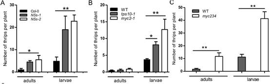 A.NSs转基因植物有利于西花蓟马种群增长 B和C NSs通过抑制MYC调控的植物茉莉酸途径来促进西花蓟马种群增长