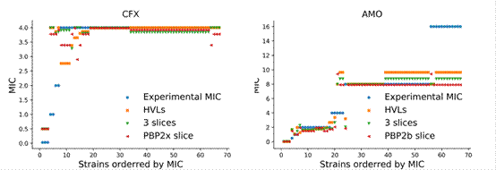 Experimental MIC: 实验测定的MIC;HVLs: 耐药相关的高度变异的氨基酸位点;3 slices: 来自3个PBPs的相关片段;PBP2b slice: PBP2b相关片段;PBP2x slice: PBP2x相关片段。