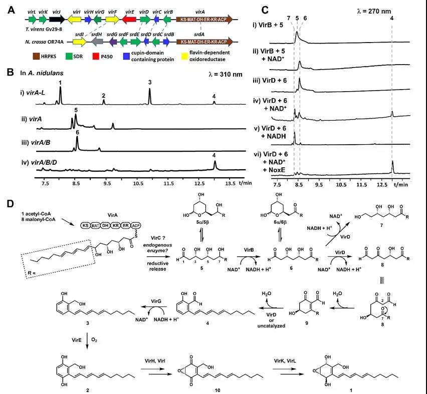 在此基础上,研究人员也对vir基因簇中其他基因的功能展开了相应的研究,并证实短链脱氢酶VirG负责4到3的转化,细胞色素P450 VirE负责3中苯环上的羟化形成2,而其他氧化还原酶VirH/I/K/L则负责2的去芳构化并将其转化成最终产物1。