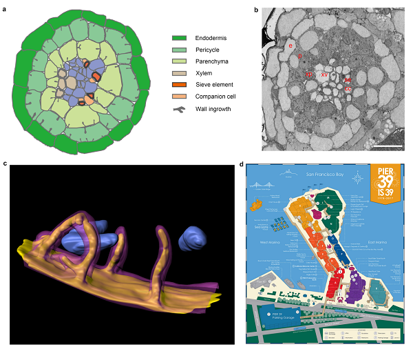 孔照胜团队的最新研究首次大尺度高分辨解析了根瘤维管系统中传递细胞的分布规律,并重构了传递细胞的内部三维结构:根瘤维管组织中的中柱鞘细胞(Pericycle)、靠近木质部导管的薄壁细胞(Xylem parenchyma)和靠近韧皮部筛分子的薄壁细胞(Phloem parenchyma)都具有内突生长的细胞壁结构,因此均作为传递细胞发挥功能(图1a, b)。传递细胞富含线粒体、内质网和胞间连丝,有利于物质的短距离运输(图1c)。