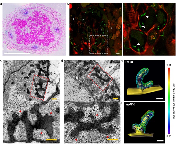 硝酸盐是土壤中最主要的无机氮素营养形式,并可作为重要的信号分子调节植物器官发育。该研究进一步发现蒺藜苜蓿中编码硝酸盐转运体的NPF7.6基因在根瘤维管束中特异表达(图2a),NPF7.6蛋白定位在传递细胞的质膜上(图2b)。NPF7.6基因敲除突变体根瘤维管束发育异常,特别是在传递细胞中存在明显的不规则锯齿状质膜结构(图2c-f)。