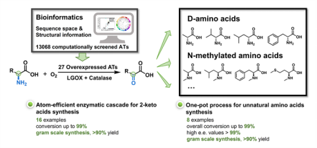 在催化剂量的谷氨酸的辅助下,该酶级联反应平台可以将绝大多数的L-氨基酸高效地转化为相应的酮酸(转化率>99%)。除此之外,该级联反应还具有很高的兼容性与延展性。该团队将酮酸合成的酶促级联反应与D-氨基酸和N-取代氨基酸的酶促反应进行偶联,进一步实现了从L-氨基酸作为出发底物,一锅法合成高附加值手性D-氨基酸和N-取代氨基酸。