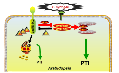 植物在进化过程中获得了一套有效的先天免疫系统以应对病菌的侵染。细胞膜上的模式识别受体(Pattern recognition receptors, PRRs)可以识别病菌保守的特征物质,如细菌的鞭毛蛋白、伸长因子和真菌的几丁质等,从而激活植物免疫。许多病菌可以分泌效应蛋白进入植物体内,干扰PRRs对病菌的识别或其介导的免疫激活通路,促进病菌致病性。PRRs有很大一部分是受体似激酶(Receptor-like kinases, RLKs),这些RLKs的典型特征是胞内含有激酶结构域,并具有激酶活性。效应蛋白通过多种方式干扰PRRs的功能,如阻止其磷酸化下游信号通路组分,或直接降解PRRs等。因此,病菌的效应蛋白的功能目前认为是主要干扰寄主抗性的。但是,在另一方面,寄主植物是否是完全被动的防御?植物中是否存在某种机制抑制或削弱病菌分泌的效应蛋白的功能?