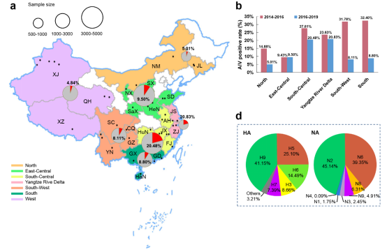 与2014-2016年相比,2016-2019年禽流感病毒阳性率显著下降;H9N2流感病毒成为鸡群和鸭群中的优势流行病毒