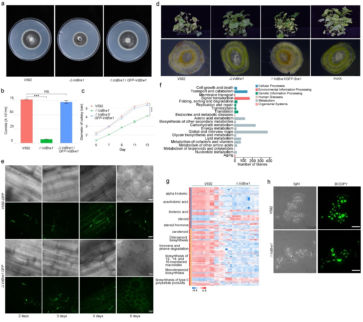图一、VdBre1能够调控大丽轮枝菌脂质代谢和次生代谢物的合成