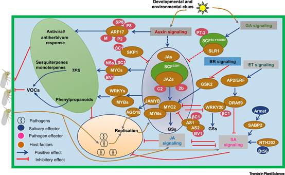 图2:虫媒病原及媒介昆虫与植物激素信号通路互作模型