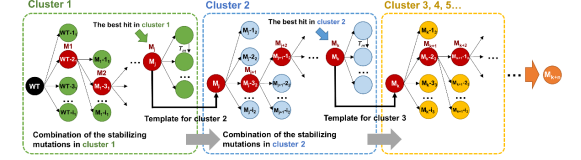 该团队首先采用融合策略,综合使用四种不同的单点预测算法辅以结构缺陷分析,预测了85个潜在有益突变。随后,他们对预测突变进行了实验检验,获得了21个有益单点突变(ΔTm ≥1.5°C)。通过K-means聚类算法,作者将21个有益单点突变分为3个Cluster,并依据贪婪算法(图2)对每个Cluster进行迭代叠加。