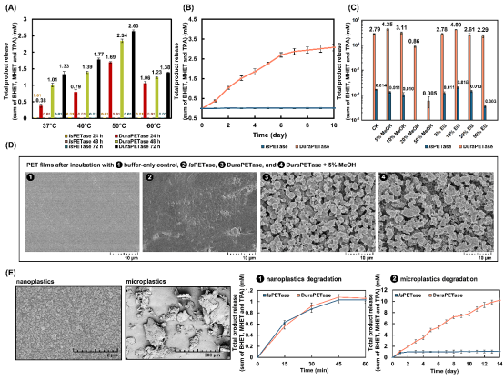 经过10轮迭代叠加,作者成功获得熔融温度提高31°C的IsPETase突变体(命名为DuraPETase)。在温和条件下,DuraPETase对30%结晶度PET薄膜的降解效率相较于野生型提升了300倍(图3B)。通过扫描电镜可观察到,经DuraPETase处理后的PET薄膜内部结构发生了显著的腐蚀变化(图3D)。