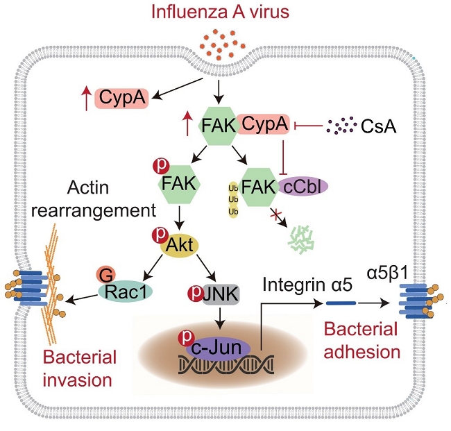 图2 流感病毒通过诱导宿主蛋白CypA的表达上调促进细菌共感染的模式图
