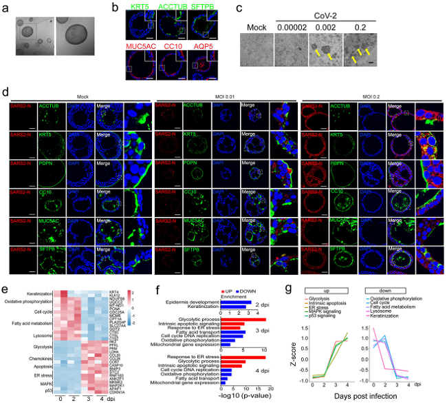 研究者从远端肺组织中培养生成人类远端支气管类器官(hDBOs),通过免疫荧光方法在这一模型中鉴定出6种细胞类型,分别为基底细胞、纤毛细胞、棒状细胞、AT1细胞、AT2细胞和杯状细胞,发现SARS-CoV-2可以感染这6种细胞类型。hDBOs感染SARS-CoV-2后,出现的病理变化与COVID-19患者的临床特征相似。对感染病毒后的hDBOs进行转录组学分析,发现一系列细胞反应:病毒感染早期角质化基因下调,随后发生从氧化磷酸化向糖酵解的代谢转换,脂肪酸代谢减少,内质网应激,细胞周期阻滞,凋亡以及溶酶体功能下降(图1)。清华大学王婷博士研究生、中科院微生物所张宁博士等为本研究论文第一作者,北京大学第三医院马少华副主任医师、中科院微生物所毕玉海研究员、清华大学陈晔光院士为通讯作者,中科院高福院士为共同作者。