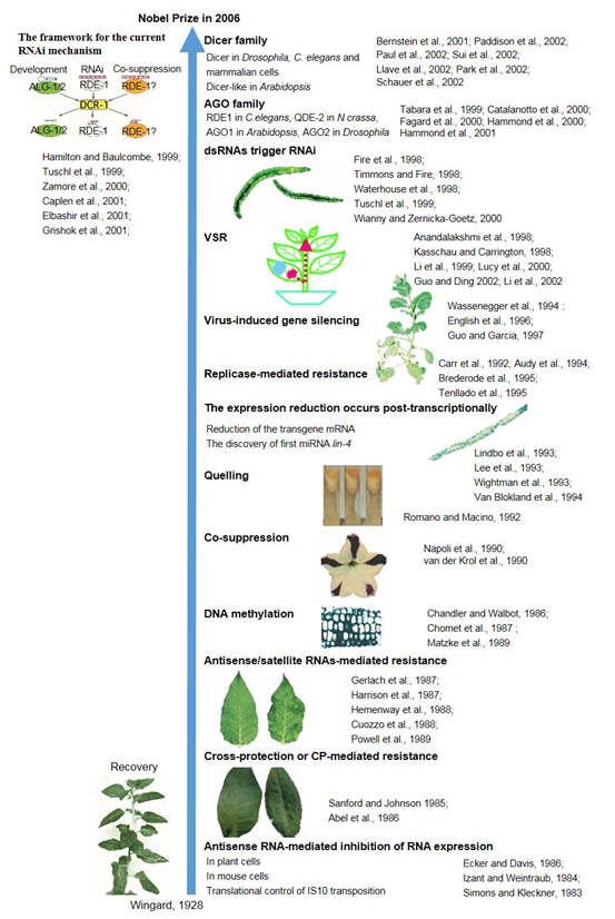 近日,中国科学院微生物研究所郭惠珊研究组应Journal of Integrative Plant Biology杂志邀请,发表了题为“RNA silencing: From discovery and elucidation to application and perspectives”的特邀综述。从1928年报道的植物被病毒侵染后产生“recovery”现象开始,到2006年诺贝尔生理与医学奖颁发给在RNAi机制研究中做出突出贡献的两位科学家,文章以时间为线索系统梳理了RNAi机制研究早期的关键代表性工作(图1)。