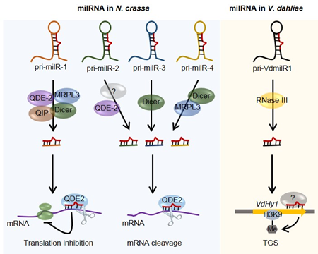 图2. 脉胞菌和大丽轮枝菌中miRNA产生和作用方式 (Zhao and Guo, 2022)。