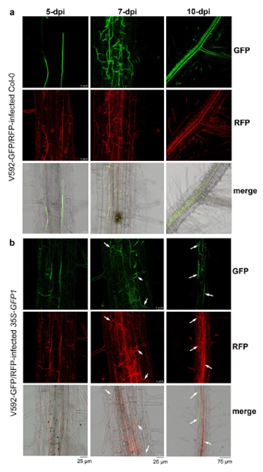 图4. GFP/RFP双标记的轮枝菌侵染野生型和转基因拟南芥荧光观察(Zhang et al., 2022)。