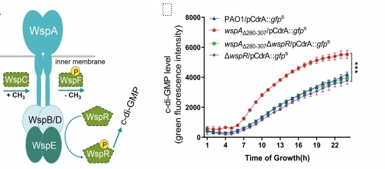 Wsp系统示意图 WspA第280-307位氨基酸残基片段缺失导致二级信使水平升高