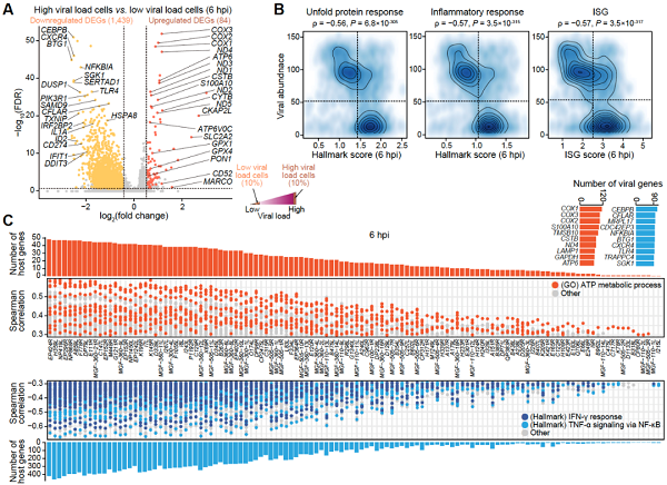通过进一步的探索,该项研究将感染暴露环境下的细胞区分为感染细胞和非感染细胞,感染细胞中不同细胞的病毒载量存在异质性。研究者发现在高病毒载量细胞中,宿主细胞上调了细胞代谢相关的基因(例如能量代谢),而下调了ISG等免疫相关的基因以及未折叠蛋白反应(Unfolded protein response,UPR)相关的基因。同时该研究构建了ASFV病毒蛋白与宿主分子的关联模式,发现病毒基因表达水平和细胞代谢相关基因表达水平呈现正相关关系。此外,本研究发现肿瘤坏死因子α(TNF-α)是ASFV诱导细胞凋亡的主要因素。