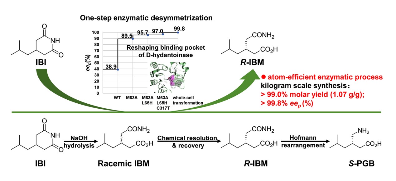 为降低环境污染,推进产业绿色发展,中科院微生物所于波研究组针对S-普瑞巴林化学工艺路线中污染严重、效率较低的R-单酰胺化学拆分步骤,开发了一步酶法手性合成R-单酰胺的技术工艺。依据底物相似性,对数据库中的酶资源进行了大量筛选,发现来自嗜热脂肪芽孢杆菌的D-苯海因酶(BsHase)具有催化环亚胺合成单酰胺的活性,但初始获得的R-单酰胺手性值eep仅为38.9%。随后科研人员对BsHase进行了理性设计和改造。分子对接模型显示,BsHase可攻击环亚胺的C10原子产生R-异构体,也可攻击C9原子产生S-异构体,活性口袋附近的三个残基Met63、Leu65和Cys317是影响底物结合的关键位点。科研人员对这三个位点进行多轮组合突变,获得的三突变体酶实现了催化环亚胺合成高手性纯度的R-单酰胺。BsHase突变体允许底物疏水异丁基基团向突变氨基酸残基方向伸展,使得用于亲核进攻的水分子中氧原子更易接近底物环亚胺的C10原子,远离C9原子,因此提高了R型产物的得率。