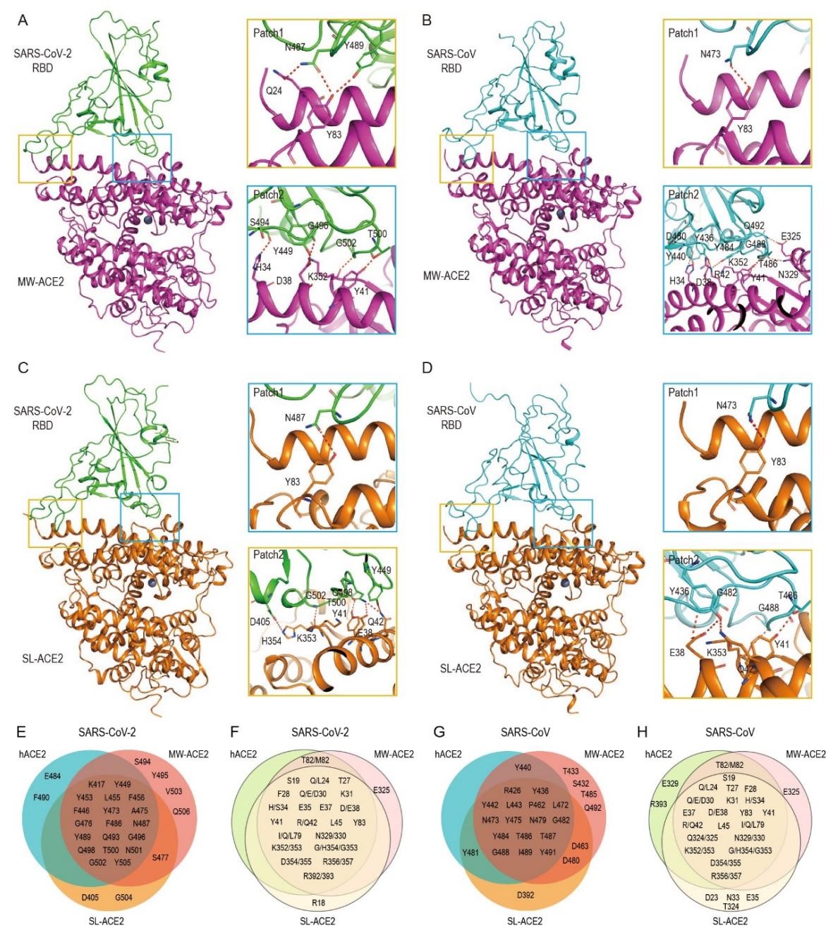 在此基础上,研究团队进一步解析了SARS-CoV和SARS-CoV-2的RBD与MW/SL-ACE2的蛋白复合物结构。通过结构分析,发现了一些影响受体结合的关键氨基酸,阐明了SARS-CoV和SARS-CoV-2与MW/SL-ACE2相互作用的分子机制(如图)。