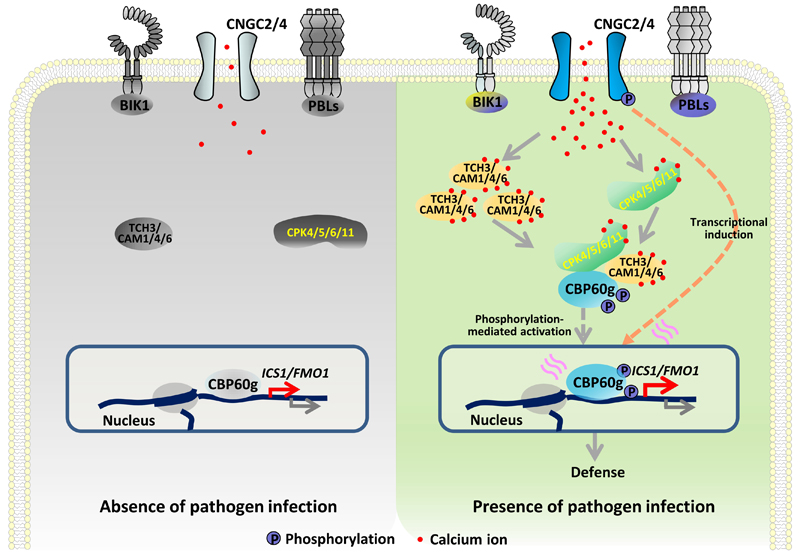 钙离子是真核生物重要的第二信使分子,参与调控众多的细胞生物学活动和过程。细胞内钙离子的浓度在感应外界信号后发生时空变化,编码特征性的钙信号,经钙感应分子解码并调控细胞反应。当受到病原微生物侵染时,植物利用细胞膜和细胞内免疫受体感知微生物来源的信号,激活钙离子通道促进钙内流。多种类型的钙感应蛋白参与识别特征性的钙信号,激活细胞免疫反应。目前对植物解码免疫相关钙信号的机制了解相对匮乏。