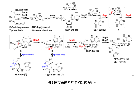 微生物所陈义华研究组和吴边研究组合作,结合天然产物化学、生物化学和计算生物学等手段研究发现,SepI通过氧化L,D-甘露庚糖(2)的4?-羟基形成酮基启动L-氨基庚糖的合成过程。随后,SepJ(C5位差向异构酶)和 SepA(C3位差向异构酶)分别催化庚糖5?和3?位的差向异构化形成4'-酮基-L-甘油-L-吡喃庚糖(8)。最后,SepG催化氨基转移至庚糖4'-酮基上生成L,L-葡萄-氨基庚糖(3)。在该合成过程中意外地发现,含4'-酮基-L-吡喃庚糖的SEP中间体可自发形成具有半缩醛-半缩酮特殊双环糖的稳定形式而存在(5和7)。