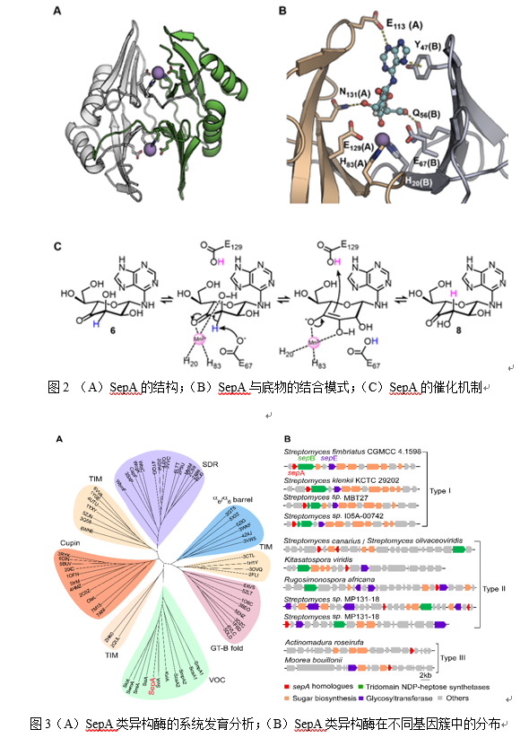 SepA是一类新型的单功能L-吡喃糖C3位差向异构酶。对SepA进行建模和实验探究表明,它属于邻位氧螯合(VOC)家族蛋白(图2A)。根据氘代溶剂交换实验、底物与蛋白的分子对接和关键氨基酸位点突变的结果,研究团队推测SepA差向异构化的催化机理是金属离子依赖的去质子化和再质子化过程(图2 B和C)。此外,团队还发现SepA类蛋白与其他家族的差向异构酶处于不同的进化分支(图3 A),代表了一类全新的金属依赖的糖差向异构酶。另外,SepA的同源蛋白不仅广泛分布在含庚糖合成酶和糖基转移酶的基因簇中,还可能参与其它糖的合成(图3B)。