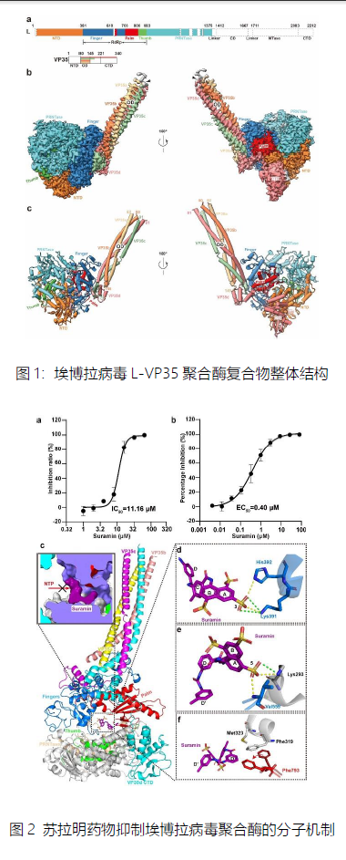 中国科学院微生物所高福/施一团队首次解析了埃博拉病毒聚合酶的结构,阐明了其合成子代RNA的分子机制,明确了不分节段负链RNA病毒在进行转录和复制时,从起始状态向延伸状态转变时的动态变化,为从分子水平理解埃博拉病毒复制机制奠定了关键理论基础;同时,该工作发现苏拉明药物能通过抑制NTP底物进入酶活中心而有效抑制埃博拉病毒聚合酶的活性,不仅为防控埃博拉疫情提供了候选治疗方案,也为抗埃博拉病毒的药物开发提供了新的靶点和方向。