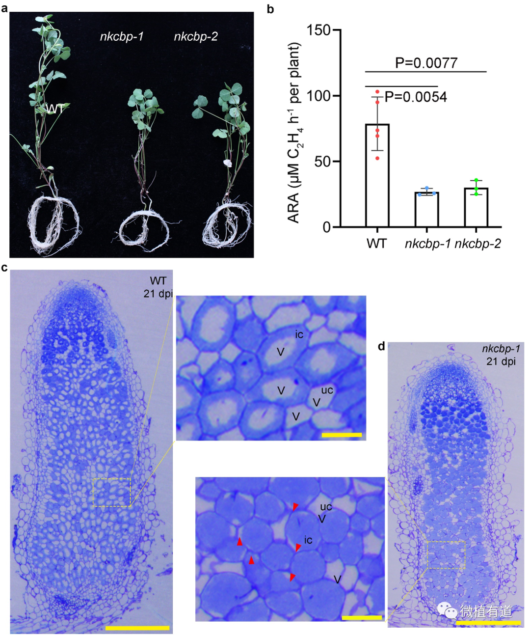 KCBP(Kinesin-like Calmodulin-Binding Protein)是植物特有的微管马达蛋白,具有同时结合微管和微丝的能力,调控细胞骨架动态重构和细胞形态建成。KCBP基因在豆科植物中特异发生基因加倍,并且演化出根瘤中富集表达的拷贝nKCBP来调控结瘤固氮。利用基因编辑技术获得了蒺藜苜蓿(Medicago truncatula)nkcbp突变体,表现出生长缺陷(图1a)和固氮能力显著下降(图1b)。进一步对根瘤的半薄切片、超薄切片进行观察发现,野生型根瘤的侵染细胞具有典型的中央大液泡(图1c和2a),而nkcbp突变体则含有大量随机分布的未融合小液泡(图1d和2b),甚至有些侵染细胞内共生体不能分化、共生体膜加厚。运用连续超薄切片扫描电镜成像(Automatic collector of ultrathin sections scanning electron microscopy, AutoCUTS-SEM)技术,对野生型和突变体液泡结构进行了三维重构(图2)。结合活细胞成像和免疫荧光染色,证实了nKCBP具有保守的生化功能,同时结合微管和微丝。进一步发现,与野生型相比,nkcbp突变体侵染细胞中细胞骨架辐射状排布被破坏而呈现随机、无序的排布模式。综上所述,nKCBP通过调节细胞骨架动态重构来调控液泡发生和共生界面形成(图3),从而控制根瘤菌内共生与高效固氮。