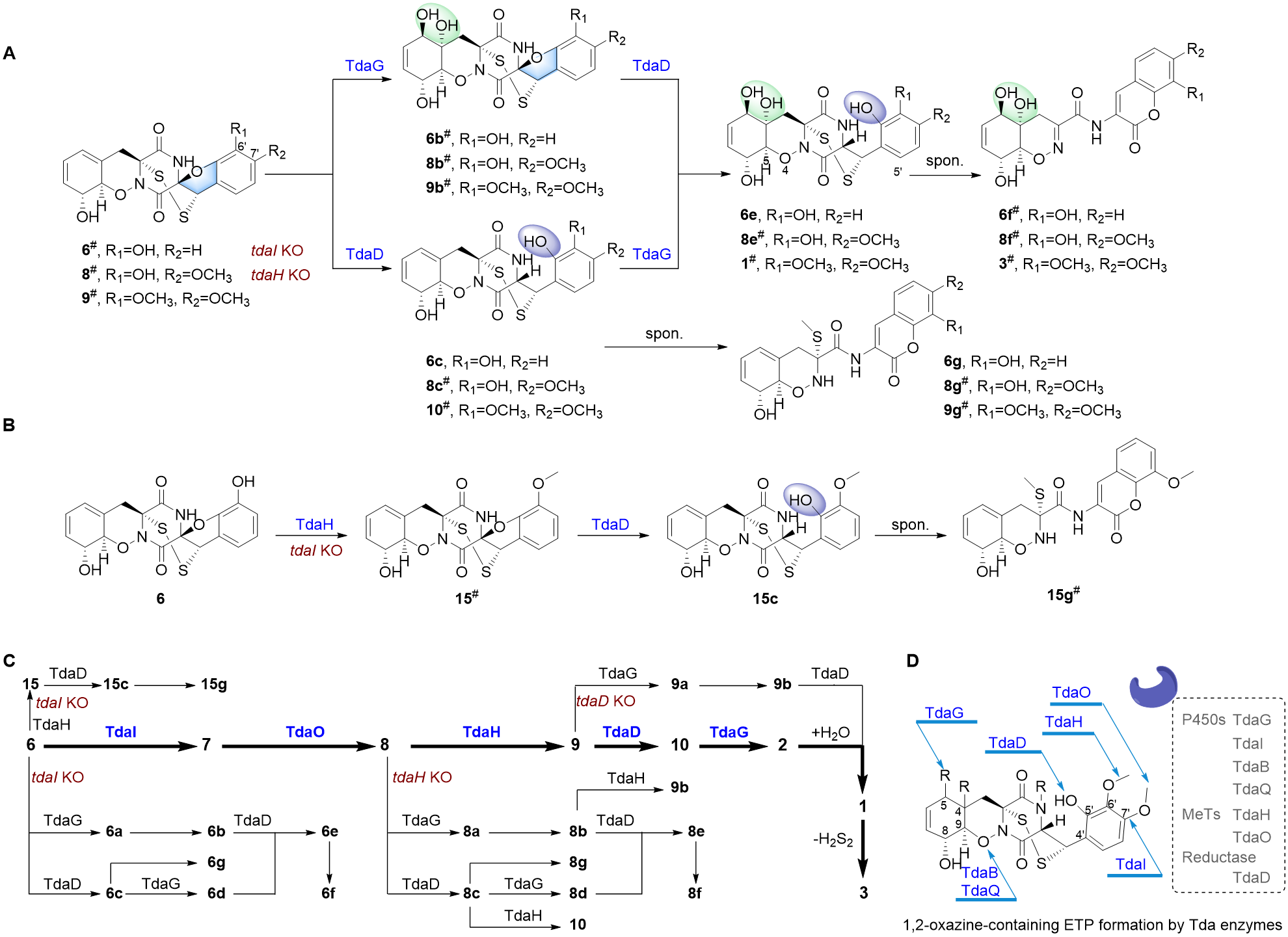 前期研究中,尹文兵团队在炭团木霉中鉴定了pretrichodermamide A和其生物合成基因簇(Chemical Science, 2021, 12, 4132-4138)。本项研究则通过基因敲除和体外蛋白反应解析α, b'-二硫桥形成后的pretrichodermamide A生物合成步骤(图2),结果发现两个细胞色素P450氧化酶TdaB和TdaQ分别催化C8, C9过氧化和N10羟基化,再经由自发环化形成独特的1, 2-噁嗪环(B环),这一发现为1, 2-噁嗪环的酶法合成提供了新元件;P450氧化酶TdaI、甲基转移酶TdaO和TdaH依次作用,完成E环的修饰;还原酶TdaD将呋喃环(D环)还原;P450氧化酶TdaG催化环己二烯结构(A环)的氧化。