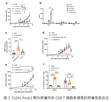 团队首先利用基质金属蛋白酶(MMPs)敏感的多肽将IL2和IL2Rα进行连接,并融合表达在CLDN18.2抗体的C端,构建了靶向CLDN的IL-2前药。通过IL2报告细胞系证明,CLDN-ProIL2的IL2活性能够被阻断至对照抗体(hIgG)水平,而经过MMP酶切后可以得到恢复。随后,研究人员在过表达CLDN18.2的小鼠肿瘤模型中证明,CLDN-ProIL2能够有效的控制肿瘤生长,没有引起明显的细胞因子风暴等副作用。同时,CLDN-ProIL2治疗增加了肿瘤浸润CD8 T细胞的数量,而进一步的T细胞删除实验和淋巴细胞阻断实验证明,CLDN-ProIL2的治疗依赖于肿瘤组织中预先存在的T细胞。最后,通过检测肿瘤组织中免疫细胞比例及表型的变化,团队发现,CLDN-ProIL2通过重塑肿瘤内CD8 T细胞的功能发挥作用。CLDN-ProIL2治疗能够增加抗原特异性T细胞、PD1+TIM3-细胞及TCF1+细胞的比例。该研究为靶向CLDN的免疫治疗策略及细胞因子治疗药物的开发提供了全新的思路。