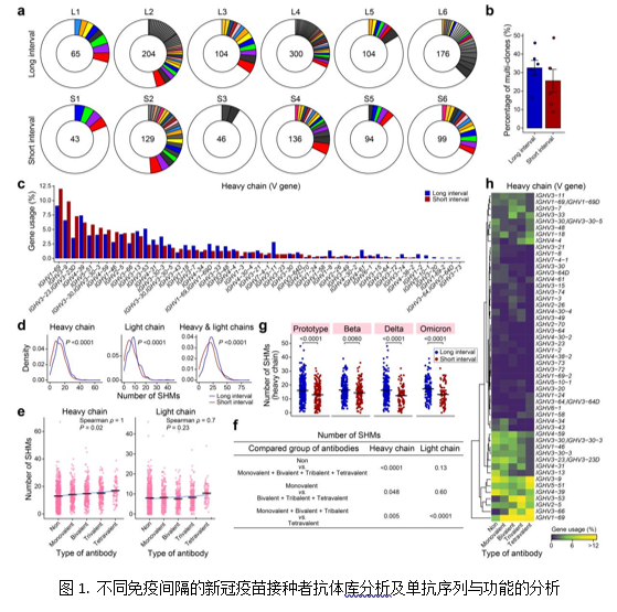 随着新冠病毒不断变异,前期发现人群中志愿者血清的跨亚型中和的能力与免疫间隔间存在显著关联。因此,研究免疫间隔如何影响免疫血清的广谱能力对于疫苗接种程序的优化具有重要意义。 该研究通过功能前置的研究方法,高通量的分析了接种新冠蛋白亚单位疫苗不同免疫间隔的人体内产生RBD特异性抗体库的差异。研究发现,二到三针免疫间隔较长(3-5个月)的志愿者中分离到的广谱抗体(从原型、Beta、Delta到Omicron-BA.1亚型)的数量多于短间隔(1个月)的志愿者,B细胞成熟度更高。并且,通过大量的抗体中和能力与序列的对应,发现抗体的广谱度与其重链的体细胞突变率呈正相关,与重链CDR3的长度成负相关。而长间隔组接种者抗体呈现出更高的体细胞突变频率和更短的重链CDR3长度。
