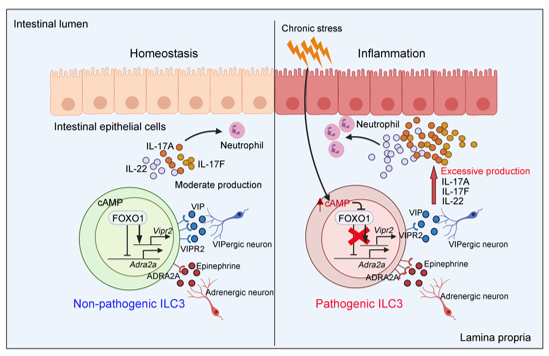 本研究发现环磷酸腺苷(Cyclic adenosine monophosphate,cAMP)信号能够抑制ILC3中转录因子FOXO1的蛋白水平,进而加重肠道炎症。研究团队发现在生理或肠道柠檬酸杆菌感染情况下,FOXO1缺失显著激活肠道ILC3, ILC3产生大量IL-17A和IL-17F等炎症因子,进而加重了肠道炎症,且该过程并不依赖T细胞。为了深入了解FOXO1对ILC3和T细胞调控机制的差异,研究人员分离了肠道固有层的ILC3和CD3+ T细胞,经过单细胞转录组测序分析,发现FOXO1可以促进ILC3的血管活性肠肽受体VIPR2的表达,并抑制肾上腺素受体ADRA2A的表达,而这两种受体在T细胞中均不表达。进一步研究发现,饮食相关的VIPR2信号抑制ILC3活化,而应激相关的ADRA2A信号促进ILC3活化并加重肠道炎症。这两种信号通路均受到FOXO1蛋白的调节,FOXO1能够结合Vipr2基因和Adra2a基因的启动子区域,促进Vipr2并抑制Adra2a基因的表达,从而调节ILC3的活化。另一方面,研究团队通过构建慢性束缚应激小鼠模型,发现慢性应激会提高小鼠体内cAMP的水平,进而抑制FOXO1的水平,介导肠道ILC3的过度活化,从而加重肠道炎症。同时,对炎症性肠病(IBD)患者和健康人肠道的活检样本分析,发现IBD患者中ILC3的神经相关通路也受到cAMP-FOXO1轴的调控。本研究揭示了FOXO1通过神经-免疫轴平衡ILC3的活化,进而调节肠道稳态(图1),研究表明禁食和精神压力分别通过抑制VIPR2信号和激活ADRA2A信号导致ILC3过度活化,可能是导致结肠炎的危险因素。