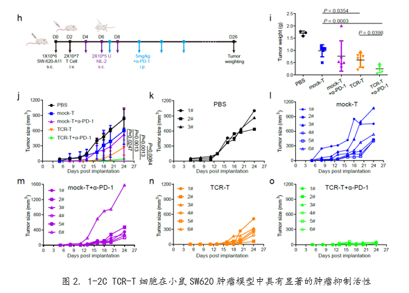 研究人员通过小鼠肿瘤模型对1-2C TCR-T细胞的肿瘤抑制活性进行了系统评价。通过不同剂量1-2C TCR-T细胞对PANC-1胰腺癌模型的抑瘤活性评价,发现中、高剂量TCR-T细胞具有显著的肿瘤抑制活性。进一步在SW620结直肠癌模型中的评价,发现1-2C TCR-T细胞与PD-1抗体联用具有显著的协同肿瘤抑制活性,且观察到其在体内能够保持长效的肿瘤抑制活性。
