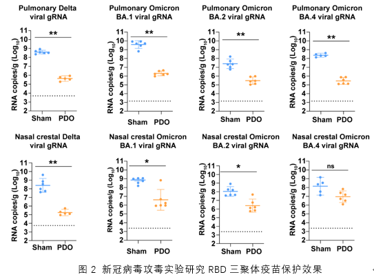 在该研究中,高福院士联合团队进一步探索了RBD三聚体的设计策略,将三个相同或三个不同新冠毒株的RBD串联,设计了原型(Prototype)新冠RBD同型三聚体(PPP)、Prototype-Delta-BA.1(PDO)和Delta-BA.2-BA.5(DBA2BA5)RBD异型三聚体进行概念验证,获得了高纯度和结构稳定的免疫原蛋白,然后通过生物化学实验和冷冻电镜结构生物学方法证明其抗原表位完全展示(图1)。最后,通过动物免疫实验证明RBD异型三聚体可诱导对多种新冠变异株广谱的中和抗体反应及强烈的T细胞免疫,通过新冠病毒攻毒实验证明其对多种毒株(Delta、Omicron BA.1、BA.2和BA.4)均具有保护作用,可以降低肺与鼻组织的病毒载量(图2)。
